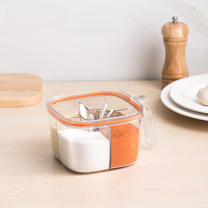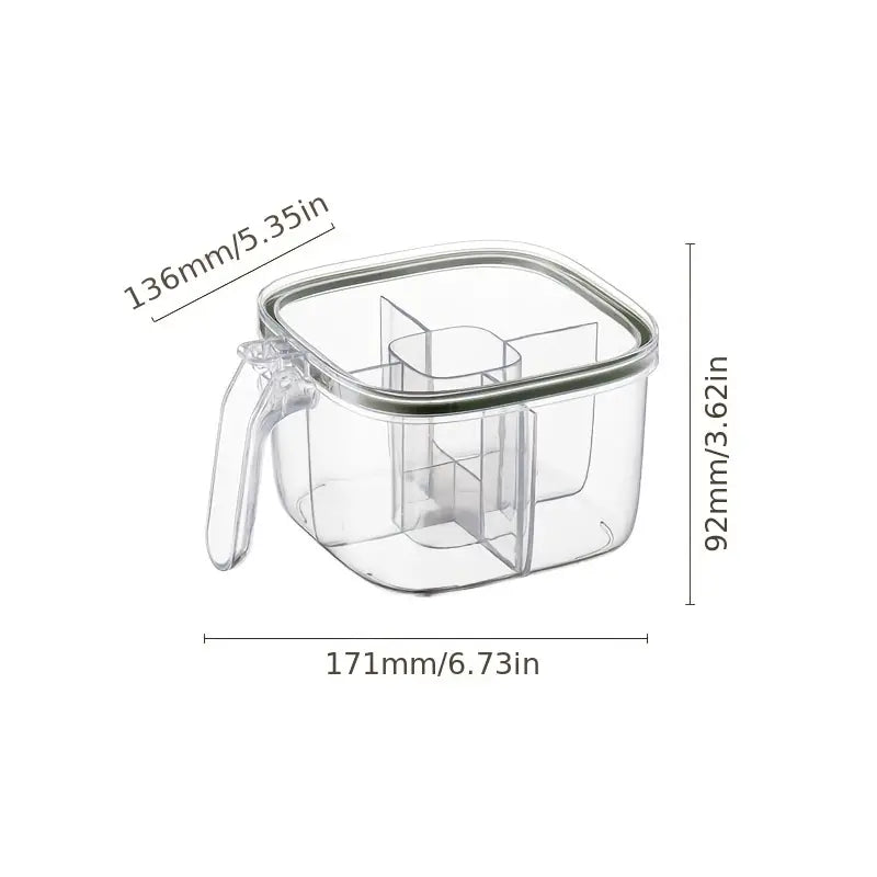 Introducing our 4 Compartments Clear Sealed Seasoning Box, designed to simplify your spice storage and organization. With four compartments and a sealed design, this seasoning box keeps your spices fresh and easily accessible. Say goodbye to cluttered spice cabinets and hello to a more organized kitchen!