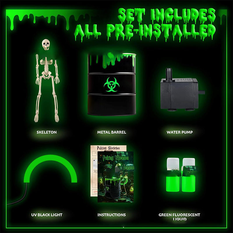 LEUCHTENDE EFFEKTE MIT UV-LICHT: Die grün fluoreszierende Flüssigkeit reagiert lebhaft auf das UV-Schwarzlicht, während die Wasserpumpe eine blubbernde Bewegung erzeugt. Zusammen erzeugen sie einen realistischen Leuchteffekt, der Ihrer Halloween-Dekoration ein magisches Ambiente verleiht.
