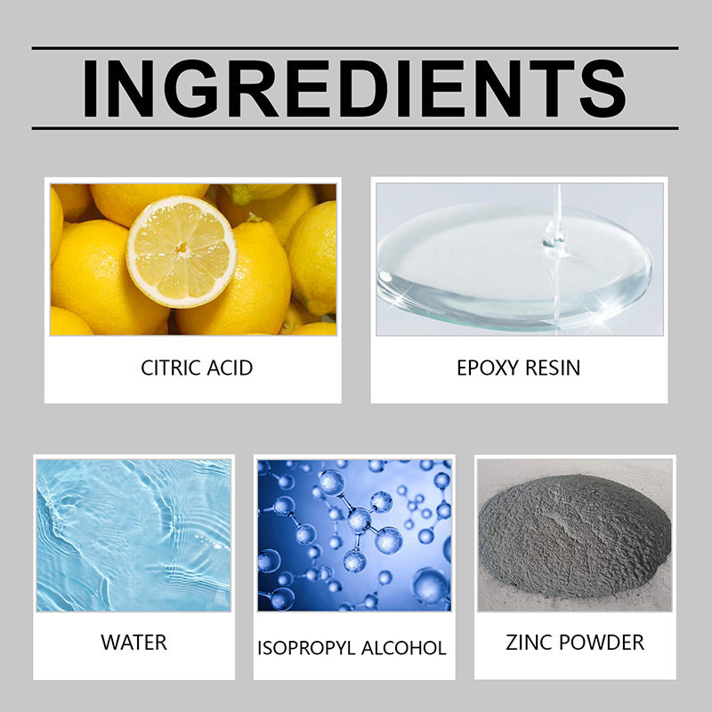 Inhaltsstoffe: Wasser, Zitronensäure, Epoxidharz, Zinkpulver, Isopropanol