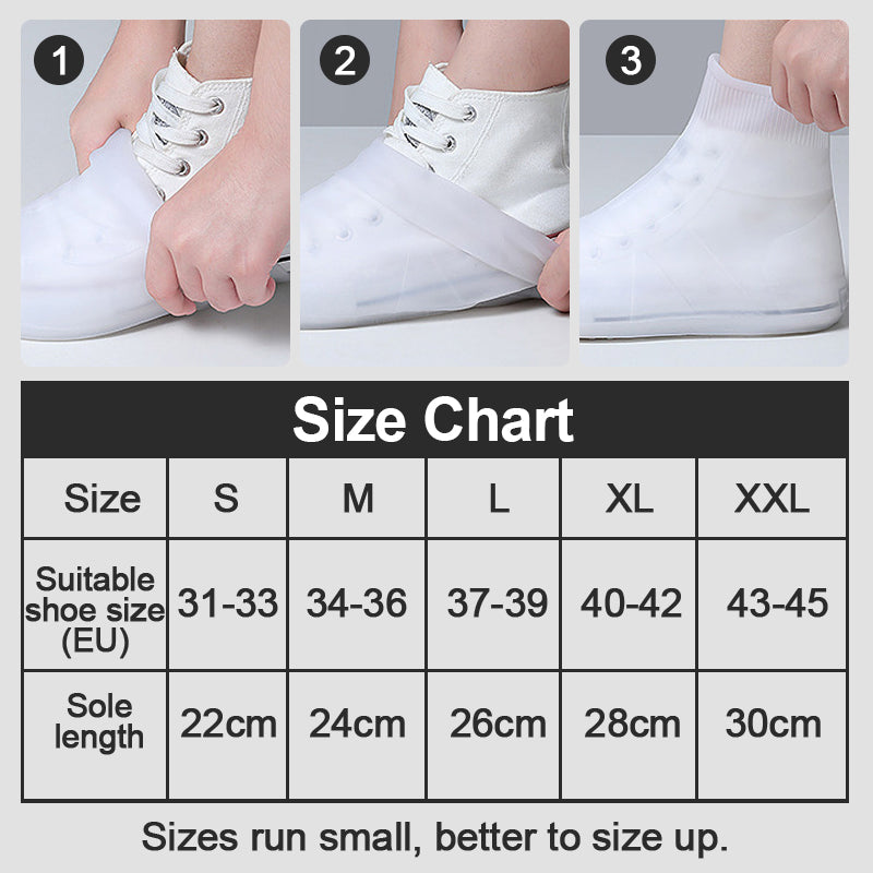 【SUPER ELASTIC】 The high-class silicone of these thickened reusable rainproof boot covers has excellent elasticity, allowing the shoe covers to be highly stretchable and durable. They can fit perfectly for a variety of shoe sizes, suitable for men and women, big kids and teenagers.
