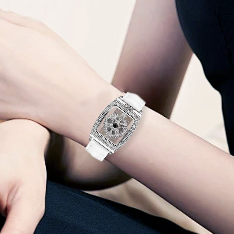 AMAZING RHINESTONE DETAILS - Das rechteckige Zifferblatt mit Strasssteinen bricht das Licht bei jeder Bewegung. Die geometrische Anordnung der Steine sorgt für einen juwelenähnlichen Glanz, der vom Tages- zum Abendkleid übergeht.