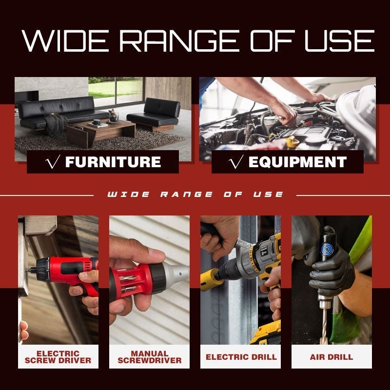 - Geeignet für Elektroschrauber, Handschrauber, Elektrobohrmaschinen und Druckluftbohrmaschinen. Ideal für Arbeiten an Motorrädern, Fahrrädern und Möbeln, zur einfachen Reparatur und Demontage von Möbeln und Geräten
