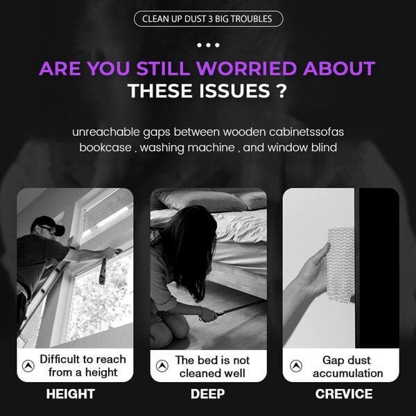 Leicht zu reinigende Bereiche, die schwer zu erreichen sind; entfernen Sie Staub mühelos. Weit verbreitet für unerreichbare Lücken zwischen Holzschränken, Sofas, Bücherregalen, Waschmaschinen und Jalousien.