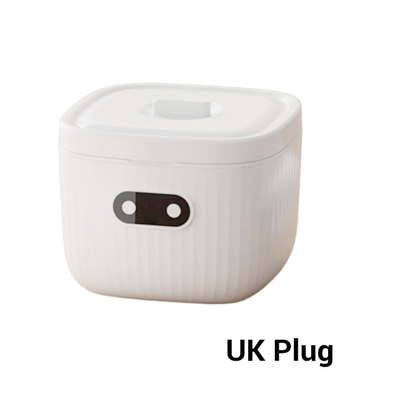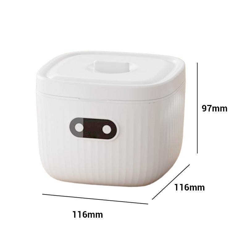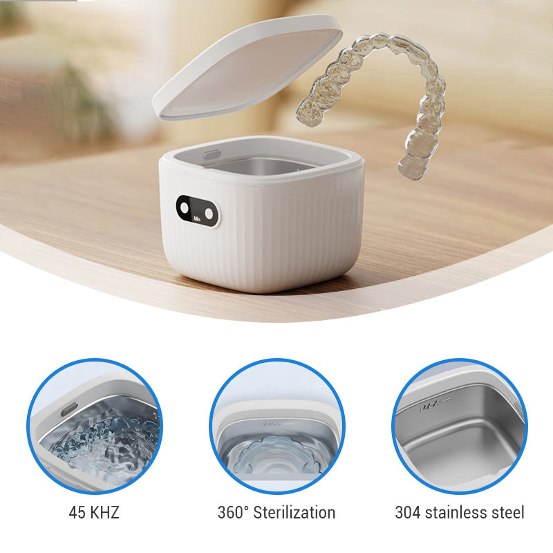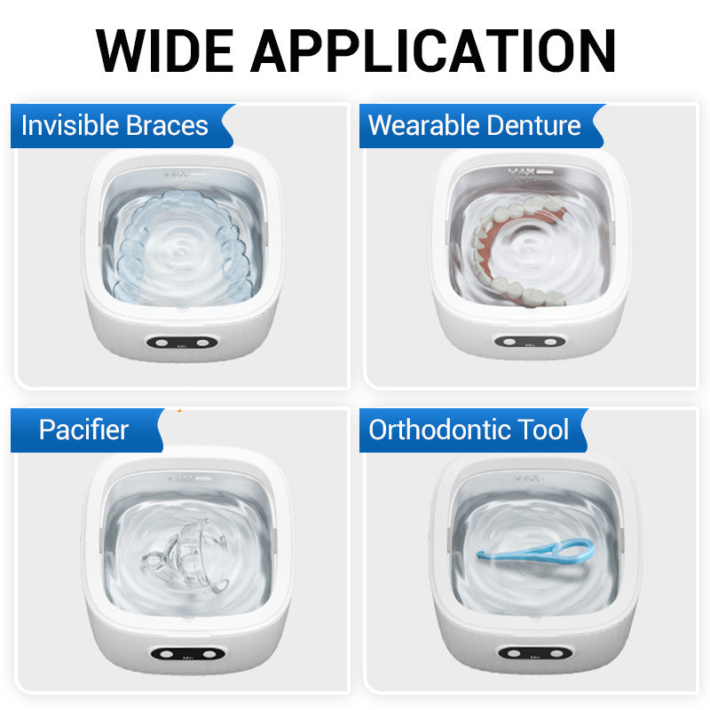 PRAKTISCHES UND VIELSEITIGES DESIGN : Entwickelt für die Reinigung einer Vielzahl von Zahnersatzprodukten wie Zahnspangen, Zahnprothesen, Schnullern und kieferorthopädischen Geräten. Dank seiner kompakten Größe passt es problemlos in jedes Badezimmer oder jede Reisetasche.